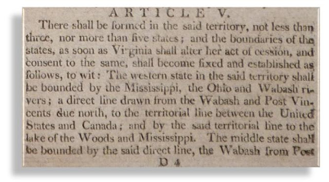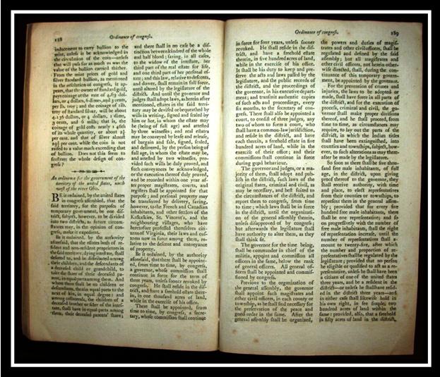 An Ordinance for the government of the Territory of the United States northwest of the River Ohio. Section 1. Be it ordained by the United States in Congress assembled, That the said territory, for the purposes of temporary government, be one district, subject, however, to be divided into two districts, as future circumstances may, in the opinion of Congress, make it expedient. …[49]